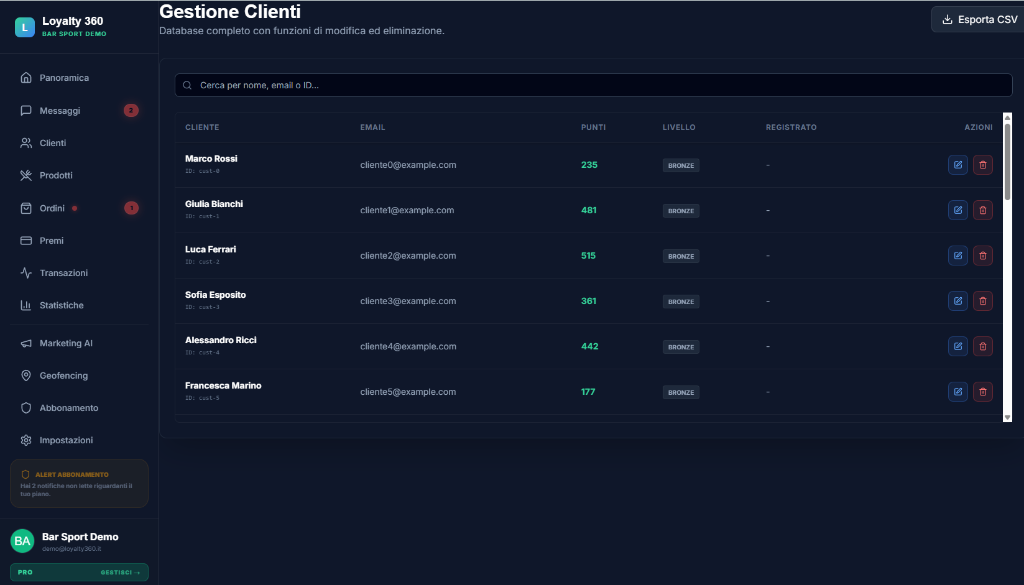 Database completo con funzioni avanzate di ricerca, modifica ed eliminazione. Visualizza punti fedeltà, livello di appartenenza e data di registrazione per ogni cliente. Esporta i dati in formato CSV per analisi esterne e campagne marketing mirate.